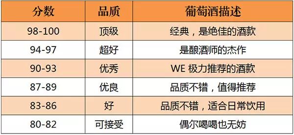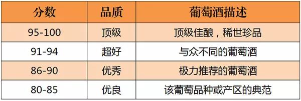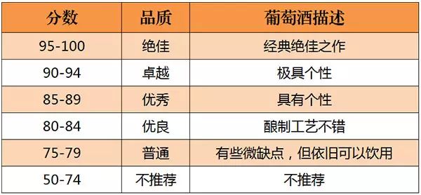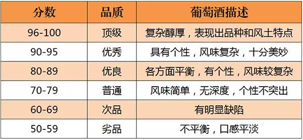 美國的《葡萄酒與烈酒》(Wine & Spirits)雜志是世界上最權威的葡萄酒雜志之一。自 1994年起,《葡萄酒與烈酒》也開始采取百分制對葡萄酒進行評分,葡萄酒首先會經(jīng)過一些葡萄酒專業(yè)人士進行初次品嘗篩選,之后才會送到專業(yè)“評酒團”品評,所以該雜志評分的葡萄酒品質(zhì)都不錯。評分標準如下所示: