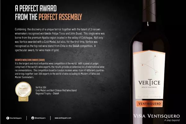 另外,該雜志還舉辦了極具影響力的醇鑒葡萄酒國際大獎賽(Decanter World Wine Awards,簡稱 DWWA)。該賽事始于 2004 年,一直是歐洲最杰出的葡萄酒競賽之一。同《醇鑒》評分體系一樣,該大賽也是采取 20 分滿分制,14.5 分以下沒有獎項,14.5-15.4 分為推薦獎,15.5-16.9 分為銅獎,17-18.4 分為銀獎,18.5 分以上是金獎。除此之外,大賽還設置了地區(qū)獎(Regioal Trophy)和國際獎(International Trophy)。如冰川酒莊神曲紅葡萄酒 2011 年份(Ventisquero Vertice Carmenere/ Syrah)就獲得了 DWWA 的地區(qū)金獎。