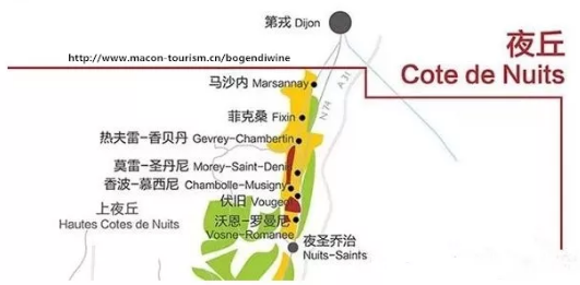 夜丘的特級園和一級園坐落在10個產(chǎn)酒村內(nèi),其中熱夫雷-香貝丹Gevrey-Chambertin、伏舊Vougeot、沃恩-羅曼尼Vosne-Romanee和夜圣喬治Nuits-Saint-Georges等村最為出名。