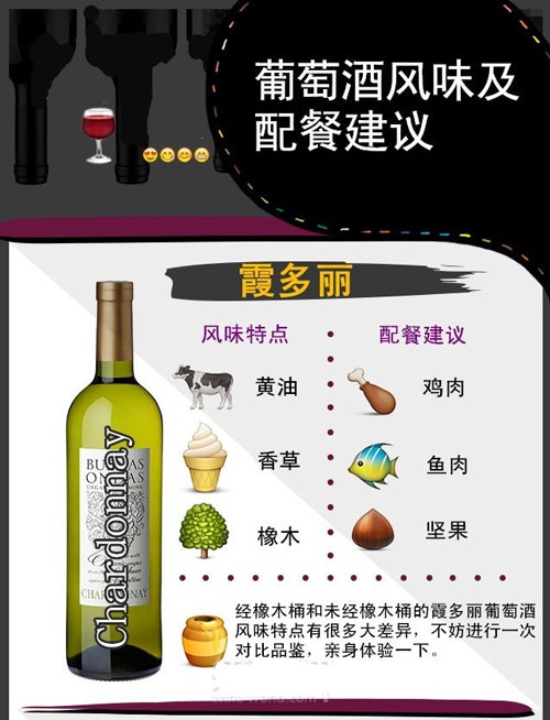 東莞藍菲城堡葡萄酒代理商用6張圖片列出最主要的6種葡萄酒,并簡要說明相應的風格特點和配餐建議。比如稱得上“千面女郎”的霞多麗葡萄酒,即可以清新脆爽,也可以豐滿順滑,而決定其風格的,除品種本身外,還有釀酒工藝,尤其是橡木桶的使用?!?strong>