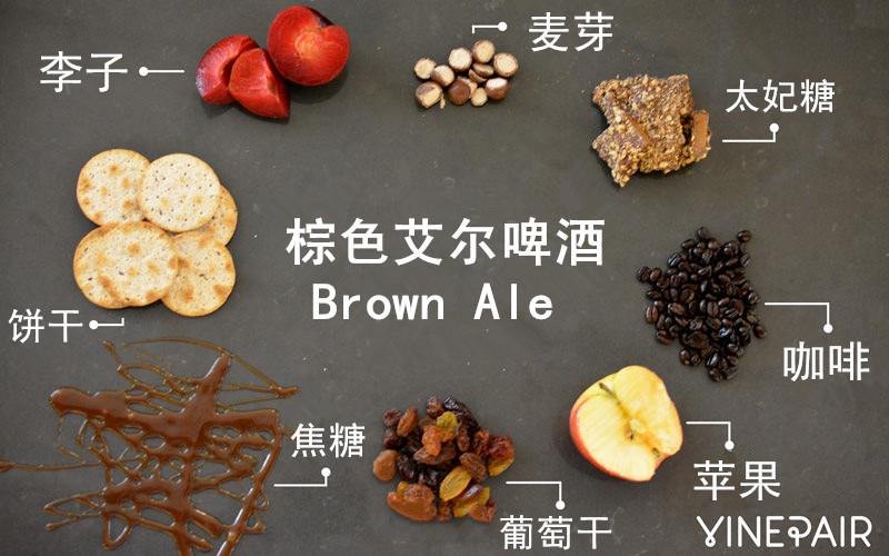 棕色艾爾啤酒含多種水果味,如蘋(píng)果、李子、葡萄干,在焦糖氣息的烘托下,其口感非常圓潤(rùn)柔順。與波特啤酒和司陶特啤酒類(lèi)似,棕色艾爾啤酒帶有咖啡、麥芽和烤餅干的味道。