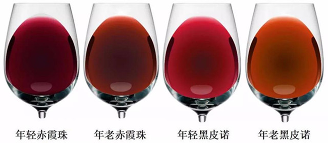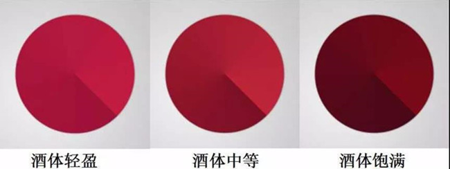 酒體輕盈的紅葡萄酒,如黑皮諾(Pinot Noir)和佳美(Gamay),顏色是從洋紅到石榴紅;酒體中等的紅葡萄酒,如梅洛(Merlot)和桑嬌維塞(Sangiovese),顏色比輕酒體的紅葡萄酒深,有點(diǎn)類(lèi)似由淺到深的磚紅色;酒體飽滿(mǎn)的紅葡萄酒,如西拉(Syrah)和赤霞珠(Cabernet Sauvignon),顏色深濃,透明度很低。