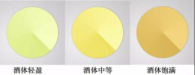 酒體輕盈的白葡萄酒,如灰皮諾(Pinot Grigio)和綠酒(Vinho Verde),顏色是從無(wú)色到淺青黃色;酒體中等的白葡萄酒,如長(zhǎng)相思(Sauvignon Blanc)和未經(jīng)橡木桶陳釀的霞多麗(Chardonnay),顏色呈淡淡的金黃色;酒體飽滿(mǎn)的白葡萄酒,如經(jīng)過(guò)橡木桶陳釀的霞多麗和維歐尼(Viognier),顏色是較深的金黃色澤。