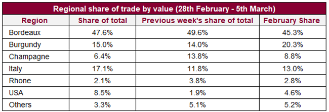 就交易總值份額而言,波爾多(47.6%)連續(xù)第二周低于指標50%。 免關(guān)稅的意大利份額則躍升(17.1%);當中2016年份占了該酒區(qū)交易超過55%。
