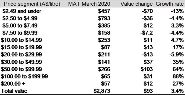 截至 2020 年 3 月底的 12 個月中,出口額最大的降幅主要出現(xiàn)在價格低于 5 澳元/升(離岸價)的澳大利亞葡萄酒。相反,價格高于 10 澳元/升(離岸價)的葡萄酒出口額則增長了 22%至 10.8 億澳元,特別是價格區(qū)間在 50 至 99.99 澳元之間的葡萄酒成為驅動澳大利亞葡萄酒出口額增長的主力軍。