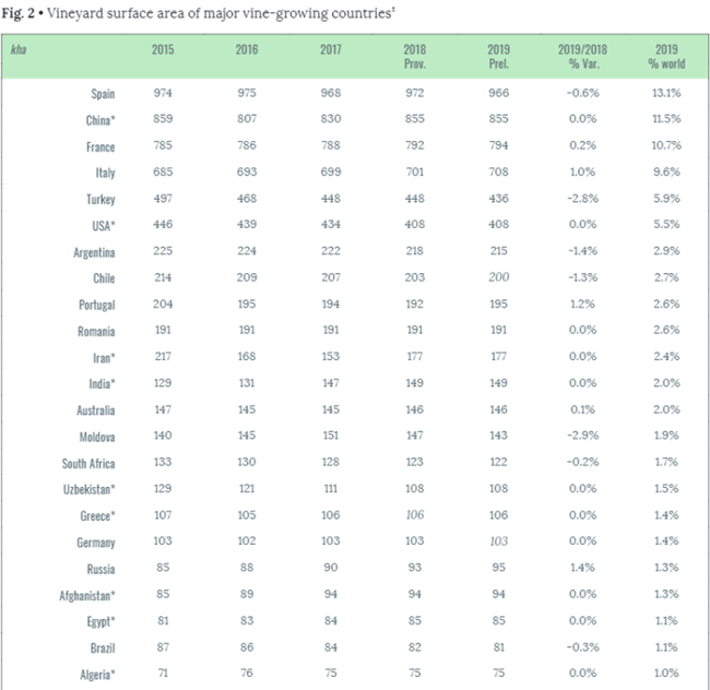 此外,與2018年相比,西班牙(966000公頃)、匈牙利(69000公頃)和奧地利(48000公頃)的葡萄園表面積略有下降。羅馬尼亞(191000公頃)和德國(guó)(103000公頃)的情況已經(jīng)穩(wěn)定下來(lái)。