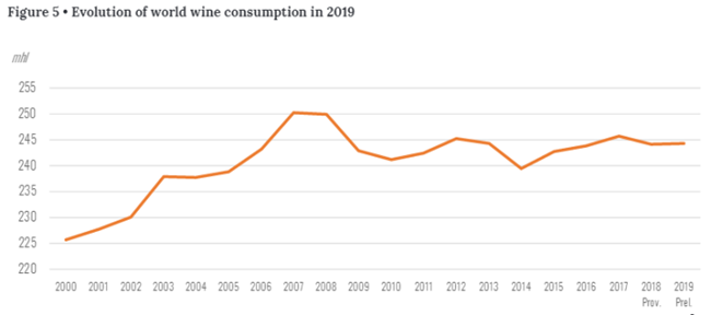 2019年世界葡萄酒消費(fèi)量估計(jì)為244 百萬(wàn)升,與2018年相比增加了0.1%。