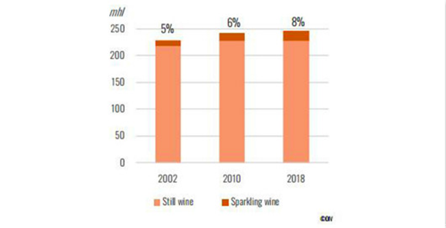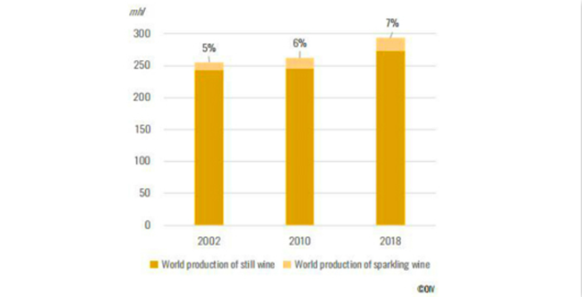 在過去的二十年里,由于全球高需求,起泡葡萄酒市場得以快速擴張。2018年,全球起泡葡萄酒的產量首次突破20億升,較2002年增加了57%。