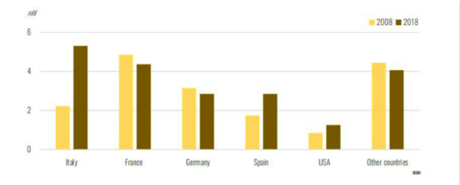 按價值計算,美國是最大的進口國(11.12億歐元),其次是英國(7.23億歐元),日本(5.23億歐元),德國(4.25億歐元),新加坡(3.08億歐元)。自2008年,美國、日本市場有了顯著增長,年平均增長率分別為9%和7%。