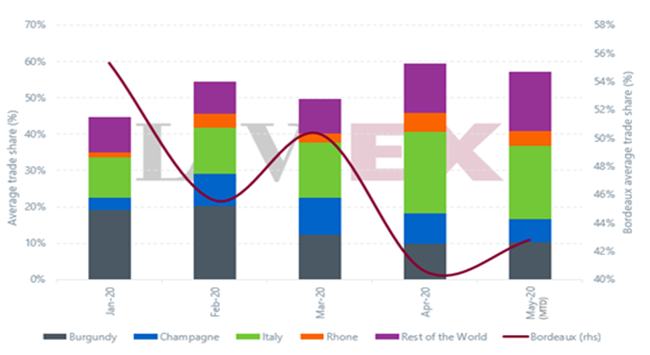 意大利成為了最耀眼的新星。上月,該酒區(qū)的交易份額升至22.5%的歷史新高;部分是由于免美國關(guān)稅、以及廣受好評(píng)的布魯諾Brunello ’15年和巴羅洛Barolo ’16的發(fā)布活動(dòng)所推動(dòng)。 羅納(5.2%)和“世界其它酒區(qū)”(13.3%)的交易份額也有增加。