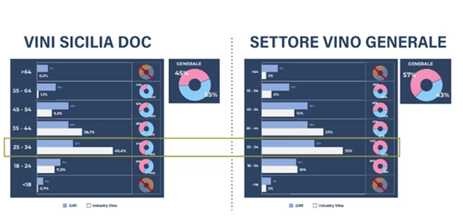 從參與西西里葡萄酒互動的用戶畫像上看,西西里法定產(chǎn)區(qū)葡萄酒的消費者要年輕很多,區(qū)間甚至低于整個葡萄酒消費的平均年齡段:25-34歲的人群非常集中??傮w來說,消費者偏 "男性化",但在18-34歲的年輕群體中,女性消費者則更為突出。