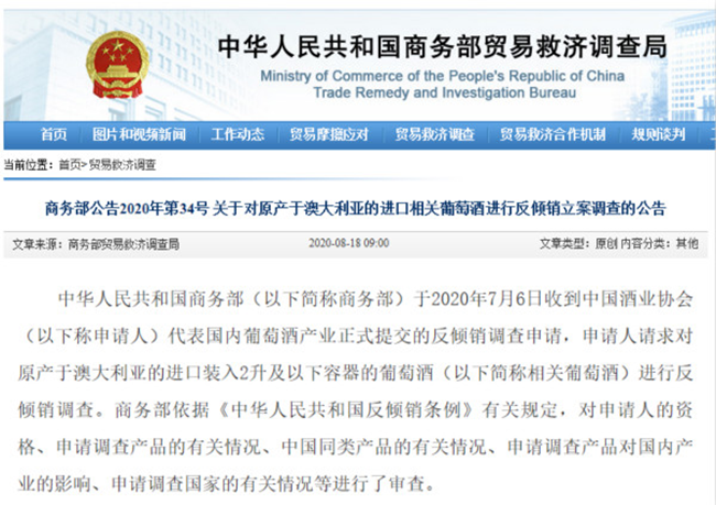 根據上述審查結果,依據《中華人民共和國反傾銷條例》第十六條的規定,商務部決定自2020年8月18日起對原產于澳大利亞的進口相關葡萄酒進行反傾銷立案調查。現將有關事項公告如下: