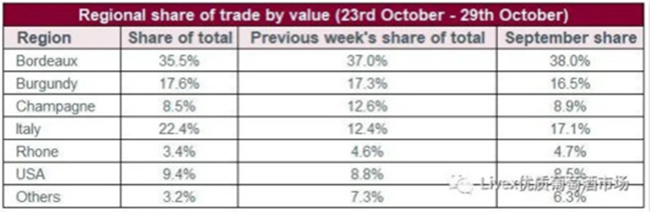 就Liv-ex上的交易總值份額而言,波爾多仍是最高(35.5%),但自年初以來(54.5%)已跌了很多。意大利保持在本年的平均水平(22.4%);美國創10月份新高(9.4%)。勃艮第也保持穩定;而香檳(8.5%)、羅納(3.4%)和其它酒區(3.2%)則有回落。