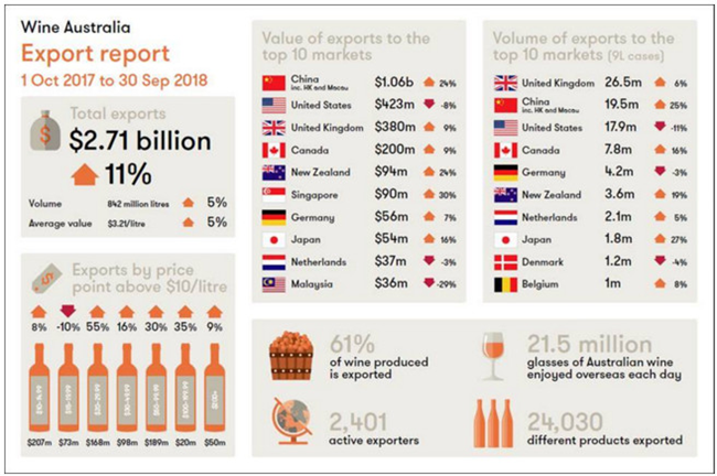 澳大利亞葡萄酒對(duì)全球出口額和出口總量持續(xù)走強(qiáng)。截止到2018年9月30日的一年中,澳大利亞葡萄酒出口總額增長(zhǎng)11%至27.1億澳元,出口總量增長(zhǎng)5%至8.42億升(或900萬(wàn)箱9升裝,見(jiàn)表2)。