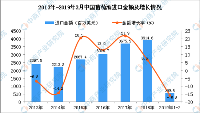從金額方面來看,2013年-2014年中國葡萄酒進(jìn)口金額有小幅度下降,2015年-2018年中國葡萄酒進(jìn)口金額增長;2019年1-3月中國葡萄酒進(jìn)口金額為549.6百萬美元,同比下降15.8%。