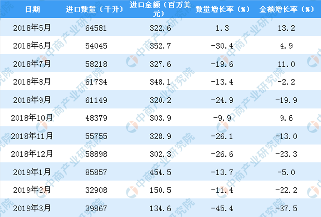 2018年-2019年3月中國葡萄酒進(jìn)口數(shù)量及金額增長率情況