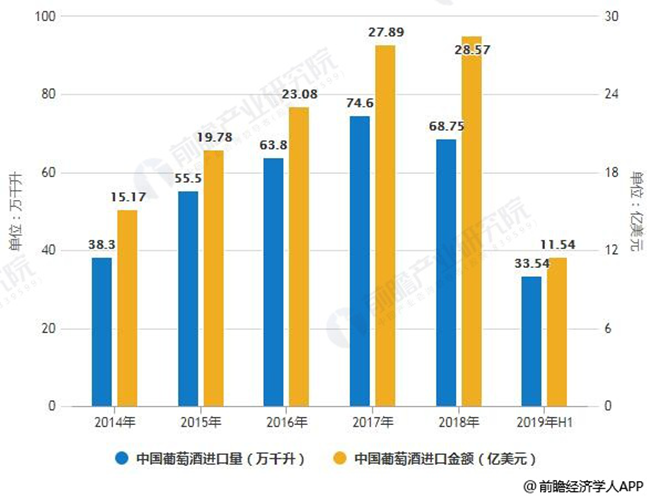 2014-2019年H1年中國(guó)葡萄酒進(jìn)口量、金額統(tǒng)計(jì)情況