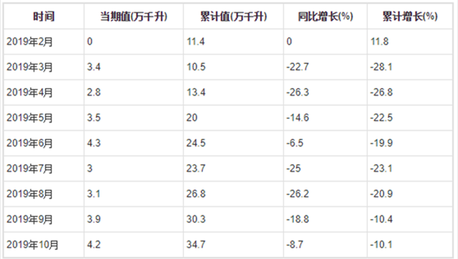 2019年10月全國葡萄酒產(chǎn)量為4.2萬千升,累計(jì)值為34.7萬千升,同比下降8.7%,累計(jì)下降10.1%。