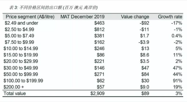 價格低于2.5 澳元/升(離岸價)的澳洲葡萄酒出口額下降最為明顯,降低了17%至4.63 億澳元。