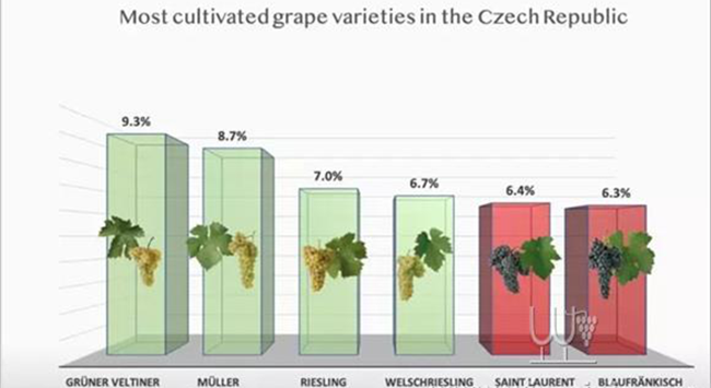 雖然捷克在種植面積上較小(約為17900公頃),卻種植了超過(guò)50多種葡萄品種,其中69%為白葡萄品種。而一些較新的葡萄藤則開(kāi)始包括了諸如摩拉維亞麝香葡萄(Moravian Muscat)、帕拉瓦(Palava)、安得雷(Andre)等本土葡萄品種。