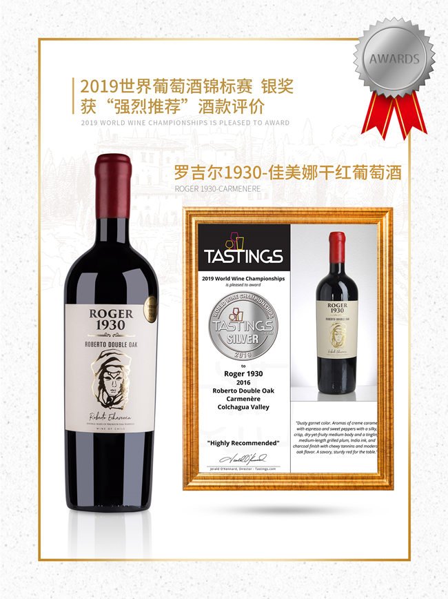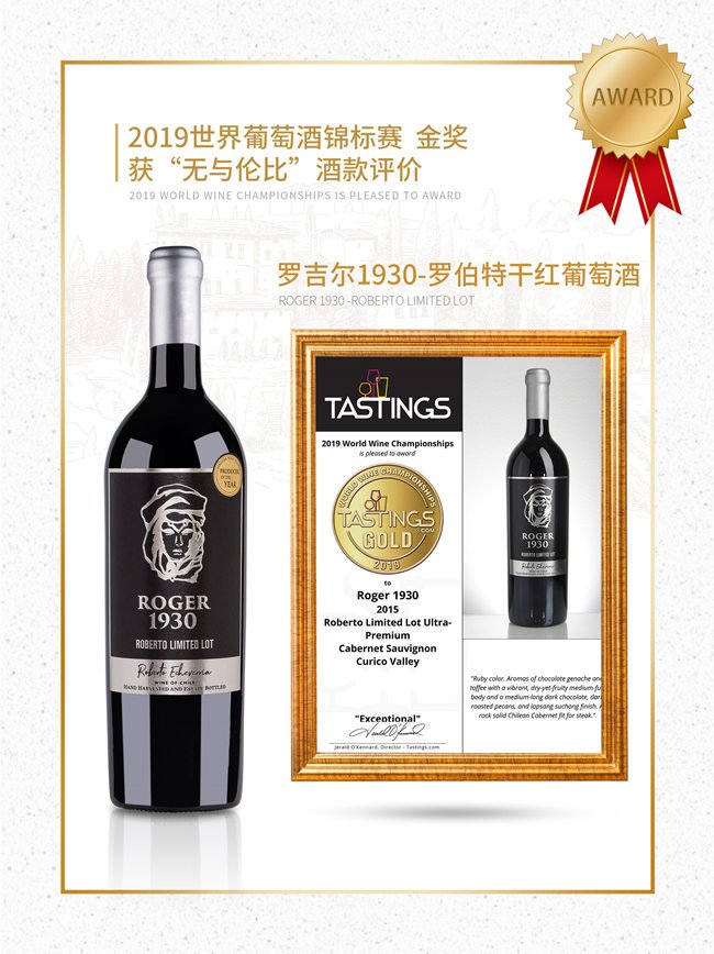 羅吉爾1930-羅伯特紅葡萄酒呈深邃的寶石紅色;酒香非常柔和,伴有精致的黑加侖,黑李子的果香以及甘草、煙熏的香氣;口感優(yōu)雅豐富,層次鮮明且多變,單寧強勁,令人十分愉悅。在榮獲2020柏林葡萄酒大獎賽金獎的榮譽之前,就已經獲得了2019世界葡萄酒錦標賽金獎的榮譽,以及“無與倫比”酒款評價!