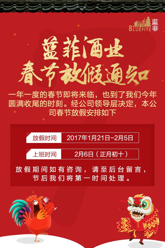 值此2017新春佳節(jié)即將到來(lái)之際,藍(lán)菲酒業(yè)全體員工恭祝您和您的家人:闔家幸福,吉祥安康!2017更加輝煌!
