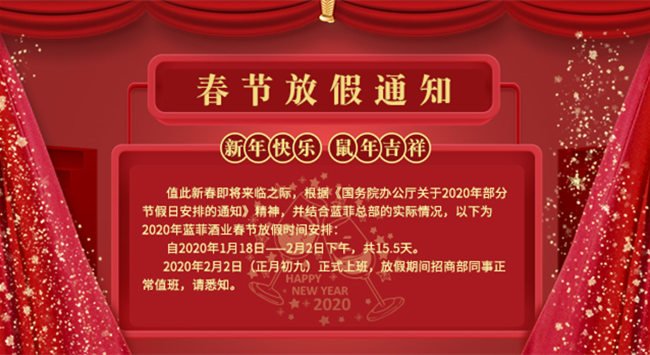 自2020年1月18日——2月2日上午,共15.5天,為藍菲酒業(yè)春節(jié)假期,于2月2日下午13: 30 (正月初九)正式上班,放假期間公司安排人員正常值班,請悉知。